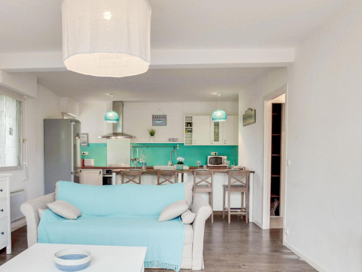 Cet appartement se compose de 1 chambre, dun salon, dune cuisine entièrement équipée avec un réfrigérateur et une machine à café, ainsi que de 1 salle de bains avec une douche.