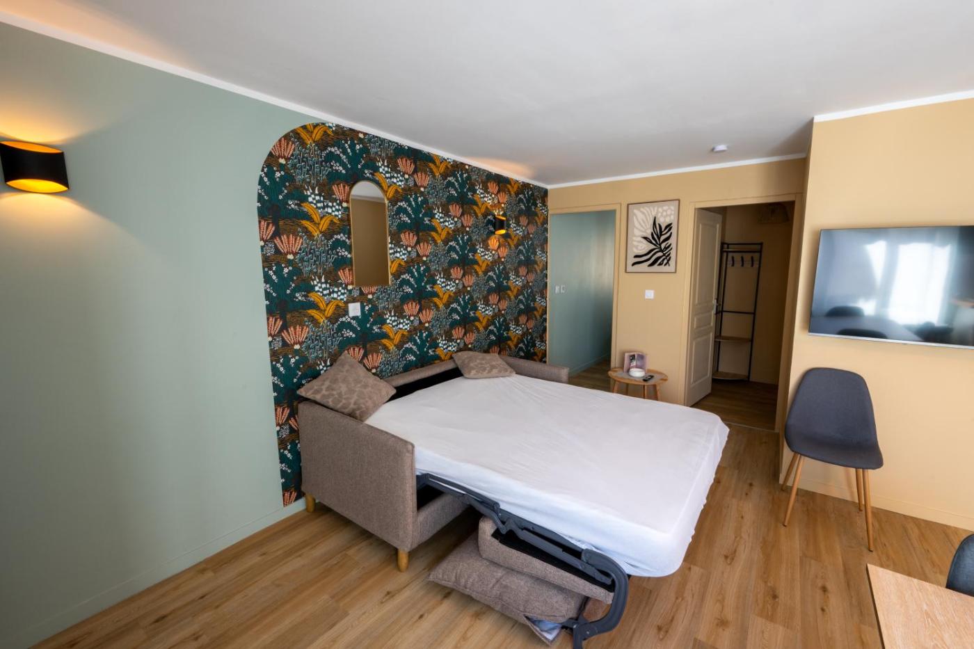 Cet appartement comporte 1 chambre, une télévision à écran plat, la climatisation et un salon.