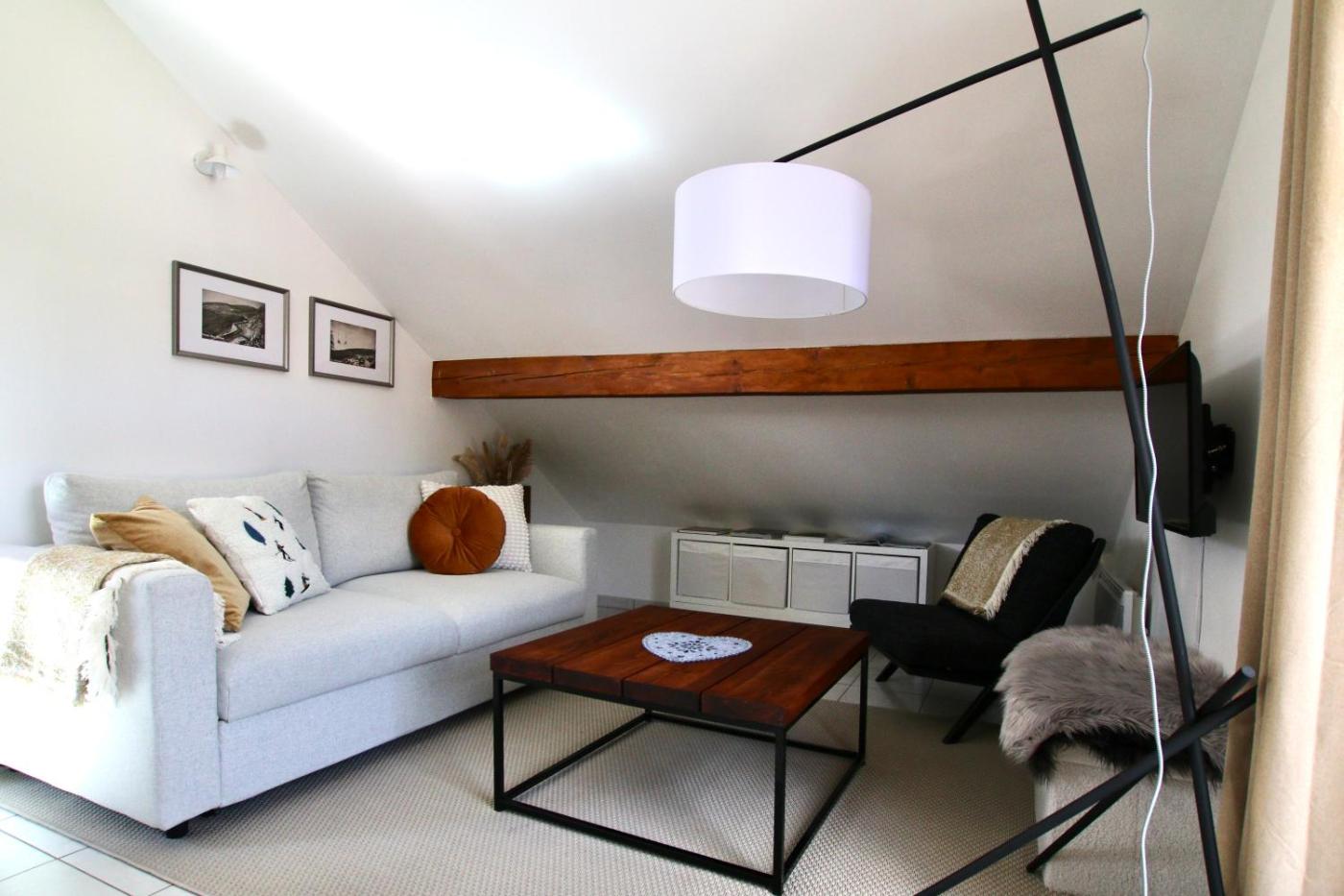 Appartement 1 Chambre - Non-Fumeurs. Featuring a private entrance, this apartment consists of 1 living room, 1 separate bedroom and 1 bathroom with a shower and a hairdryer. The fully equipped kitchen features a stovetop, a refrigerator, kitchenware and an oven. The apartment provides a flat-screen TV with streaming services, a washing machine, a tea and coffee maker, a seating area as well as mountain views. The unit offers 2 beds.