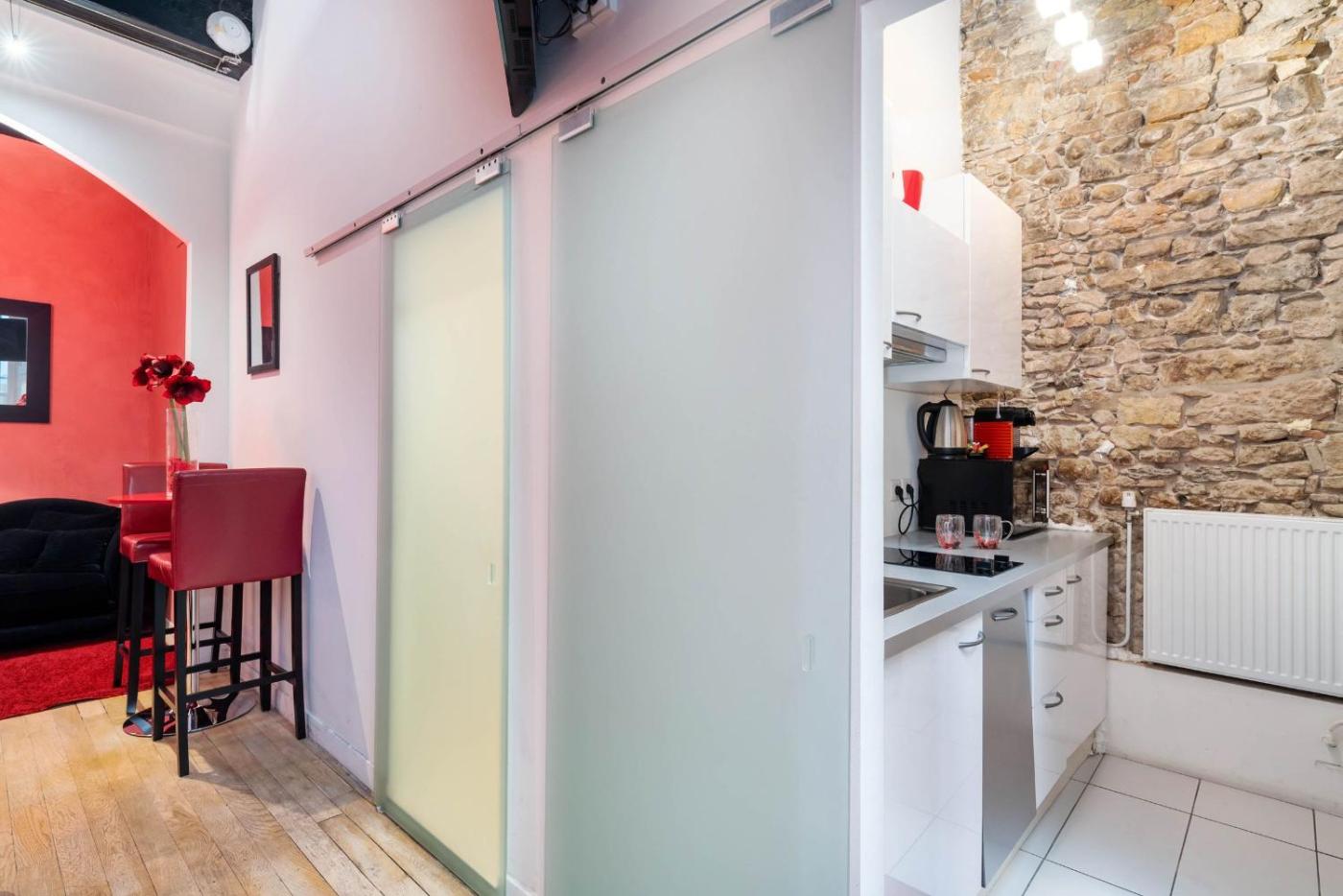 Appartement 1 Chambre. Boasting a private entrance, this air-conditioned apartment includes a kitchen, 1 bedroom and 1 bathroom with a shower and a hairdryer. In the fully equipped kitchen, guests will find a stovetop, a refrigerator, kitchenware and a microwave. The apartment offers a tea and coffee maker, a dining area, a wardrobe, heating and a flat-screen TV. The unit has 1 bed.