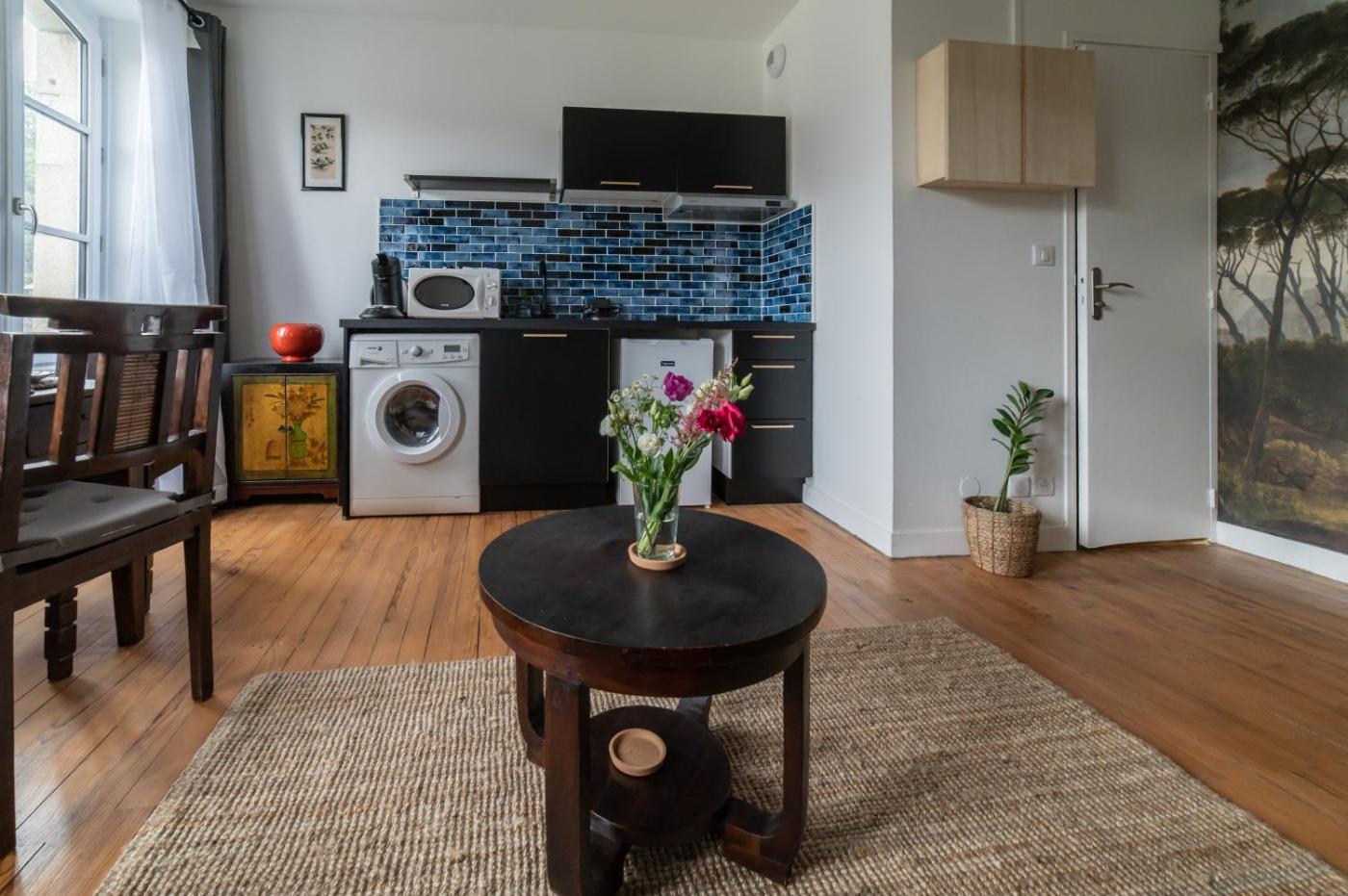 Studio avec Canapé-Lit. The studio provides a dining area and a sofa, as well as a private bathroom featuring a shower. The studios kitchen, which features a refrigerator and a microwave, is available for cooking and storing food. The studio offers a washing machine, a private entrance, a coffee machine, a flat-screen TV, as well as city views. The unit offers 1 bed.