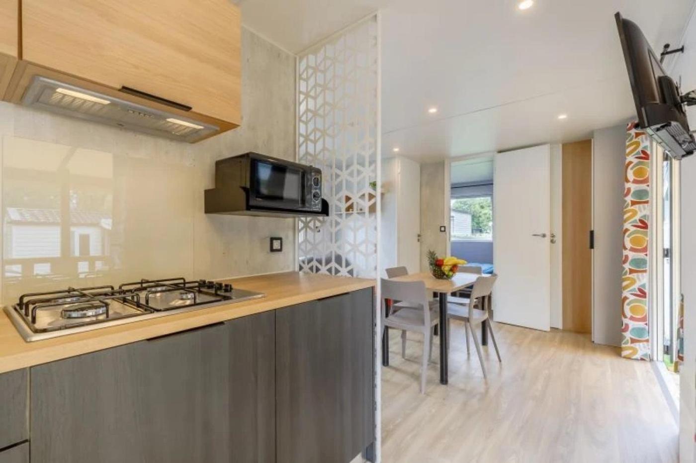 Mobile Home 2 Chambres. The sauna is the standout feature of this mobile home. Boasting a private entrance, this mobile home comes with 2 bedrooms and 1 bathroom with a shower. Guests will find a stovetop, a refrigerator, kitchenware and a microwave in the well-equipped kitchen. The mobile home also includes a barbecue. This mobile home features heating and a TV. The unit has 4 beds. ;