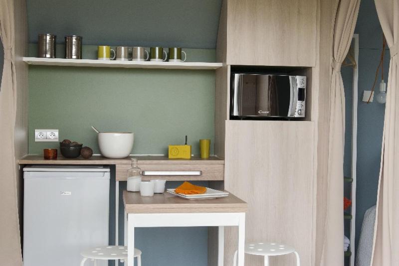 Tente sans Salle de Bains (4-5 Adultes). La cuisine bien équipée est dotée de plaques de cuisson, d’un réfrigérateur, d’ustensiles de cuisine et d’un micro-ondes. La tente comprend un barbecue. Cette tente dispose dune machine à café, dun coin salon et dun coin repas extérieur. Elle bénéficie de l’accès à une salle de bains commune. Ce logement comprend 4 lits. ;