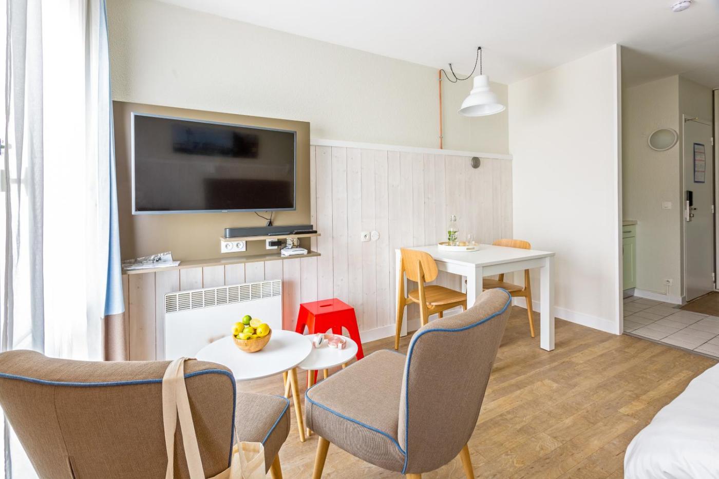 Studio avec terrasse (3 personnes) - Rez-de-jardin. Ce studio dispose dune pièce à vivre avec 1 lit double et 1 lit gigogne. L’hébergement comprend 1 salle de bains avec une baignoire. La kitchenette entièrement équipée s’ouvre sur la pièce à vivre. Vous devrez nettoyer le coin cuisine avant votre départ. Ces logements ont une vue sur le jardin de la résidence. Les hébergements sont aménagés au rez-de-chaussée. ;