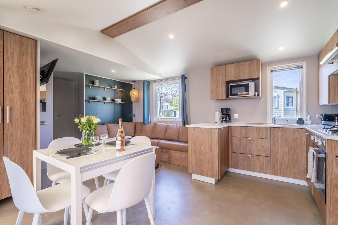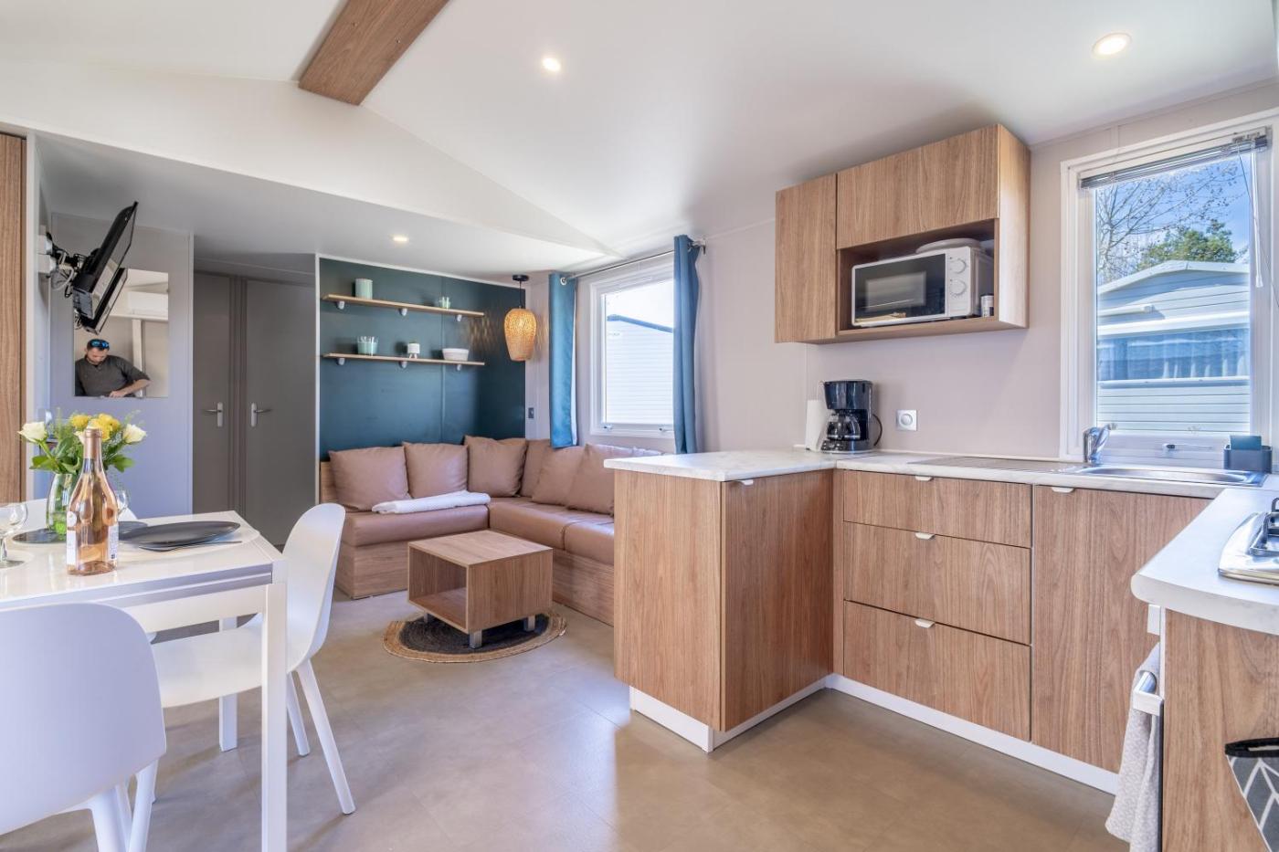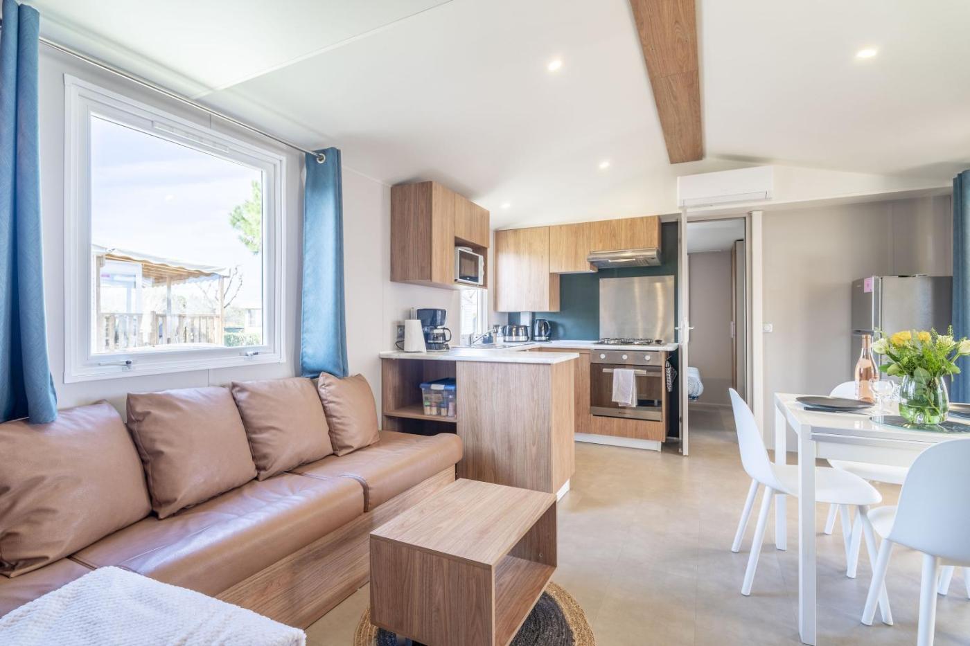 Mobile Home. The air-conditioned mobile home features 3 bedrooms and 2 bathrooms with a shower and a hairdryer. Meals can be prepared in the kitchen, which comes with a dishwasher, kitchenware and a microwave. This mobile home has a washing machine, a coffee machine, a TV and a patio. The unit offers 5 beds.